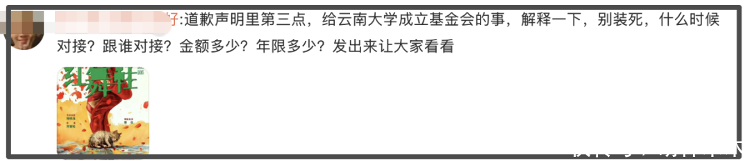 在剧组发布道歉声明后,其中提到了要以小猫“小橘子”的名义成立基金,当时校园内的猫猫驿站负责人就及时评论,问剧方这个基金到底是和谁对接的,因为猫猫平时都是猫猫驿站里的学生们在管,校方没有直接管理这些流浪猫。