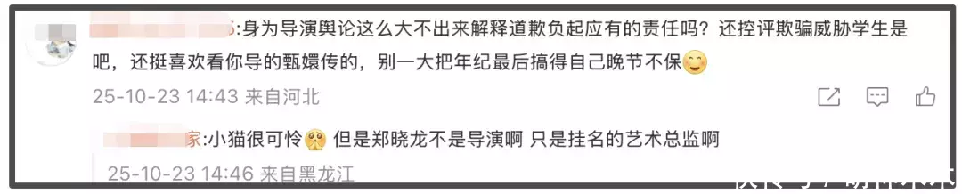 还有网友直接上升到人身攻击,称郑晓龙人文关怀素养为零,什么钱都赚,姜文当年也在学校里拍过戏,他们都遵守校方规定,人家什么事都没有,到郑晓龙这就一堆负面消息。